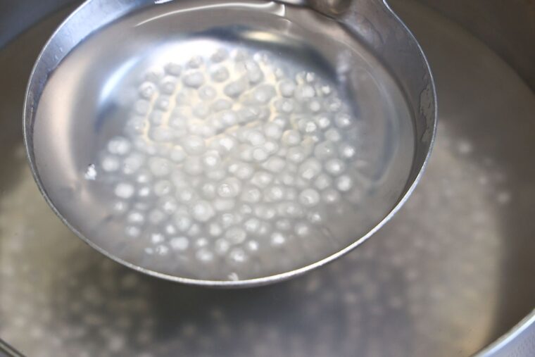 (1). タピオカを表示通りに茹でて、水で冷やしてザルにあげておく。 すいかを小さめの角切りにして種をとる。