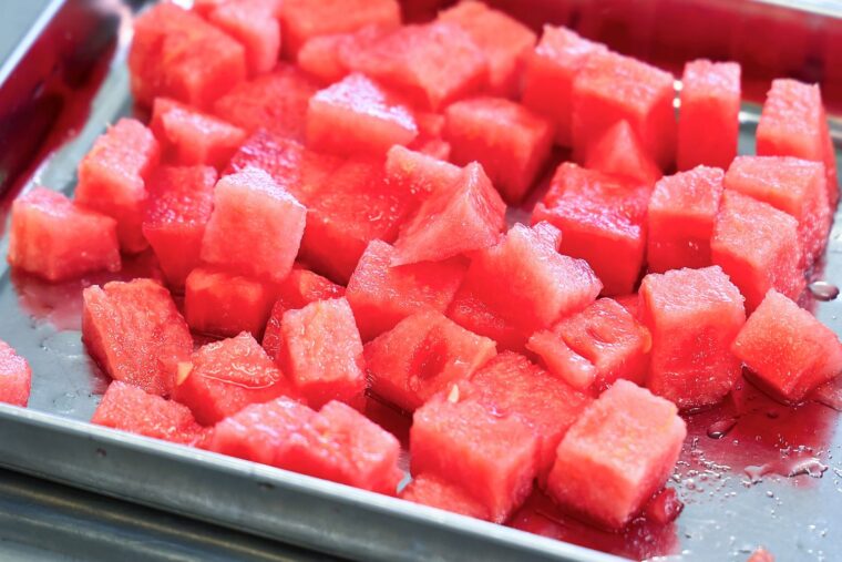 カットした皮付きのすいかは、乾燥や酸化を防ぐため、切り口にぴったりとラップを密着させて包み、冷蔵庫で保存するのが最適です。
