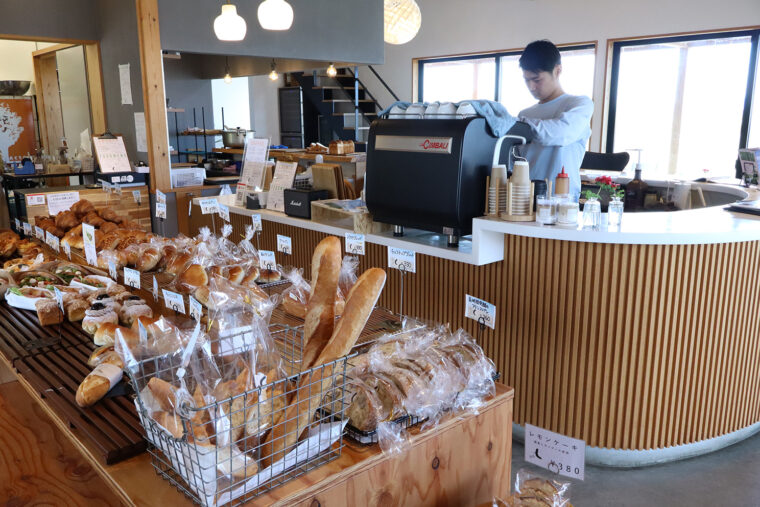 店内には自社生産の小麦・ゆきちからを使用したパンをはじめ、地元・黒鳥産の枝豆などの野菜がズラリ。