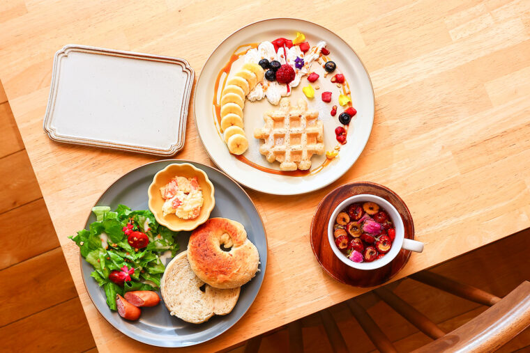 おすすめは、長岡市内でベーグルの通信販売を行なっているおいといSHOP のサトイモベーグルを使用した『ベーグルプレート』や、ワッフルにフルーツを華やかに盛り合わせた『ワッフルプレート』。