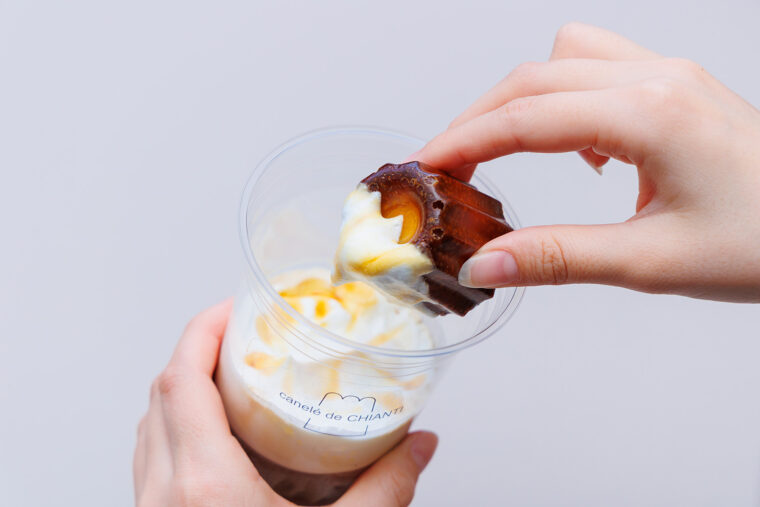 カヌレを生クリームにディップして食べてもよし、ドリンクと生クリームを混ぜて飲んでもよし。