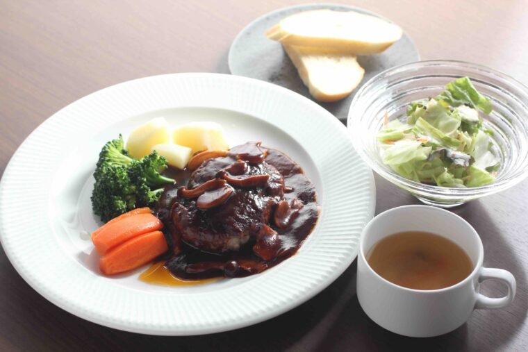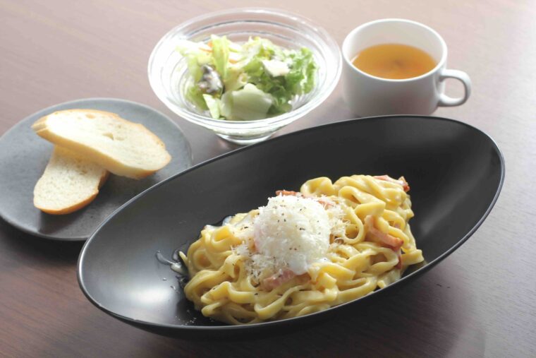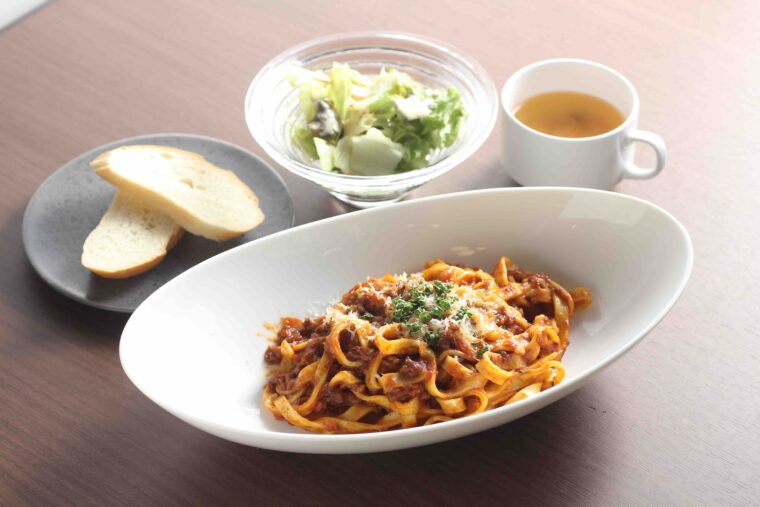 ランチタイムには弥彦産の小麦・ユキチカラを使用した『村上牛のボロネーゼパスタ』や『ツバメファームの卵のカルボナーラ』(各1,480円)のほか、『村上牛の煮込みハンバーグ』(1,680円)を提供。