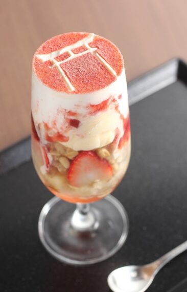 彌彦神社の鳥居をモチーフにした『苺ティラミスパフェ』(1,080円)や、鳥居をかたどったクッキーをトッピングした『ブルーベリーパフェ』(1,080円)も大人気!!