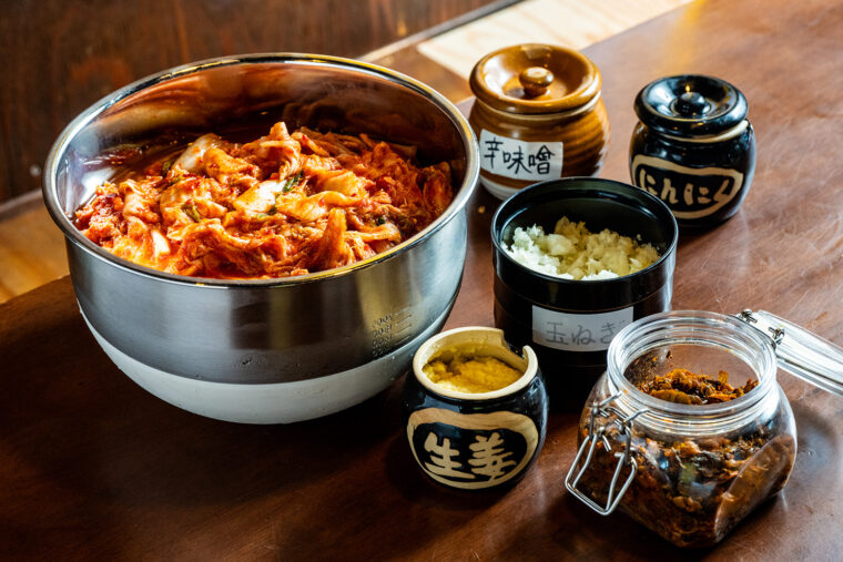 卓上には自家製のキムチ、高菜、刻み玉ネギ、ニンニク、ショウガなどのトッピングや味変調味料が用意されています。これだけあるとついいろいろな組み合わせを試したくなります!