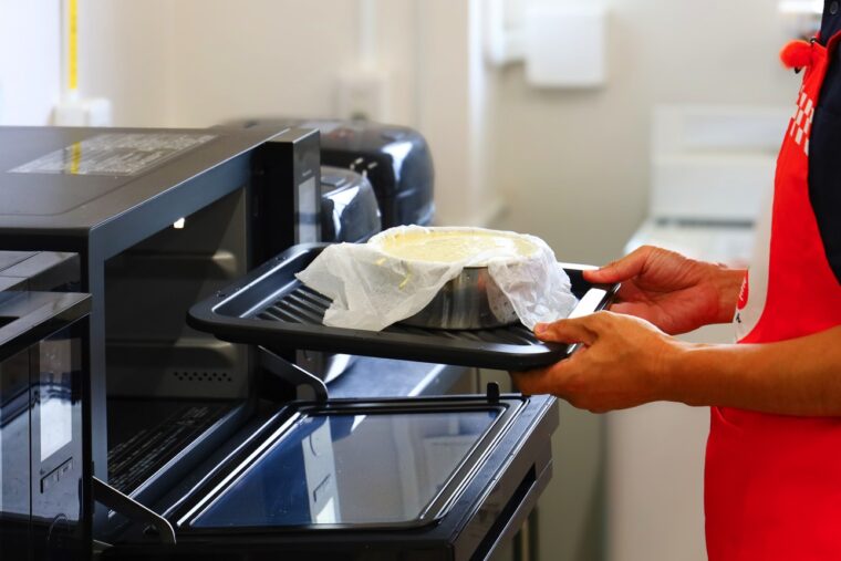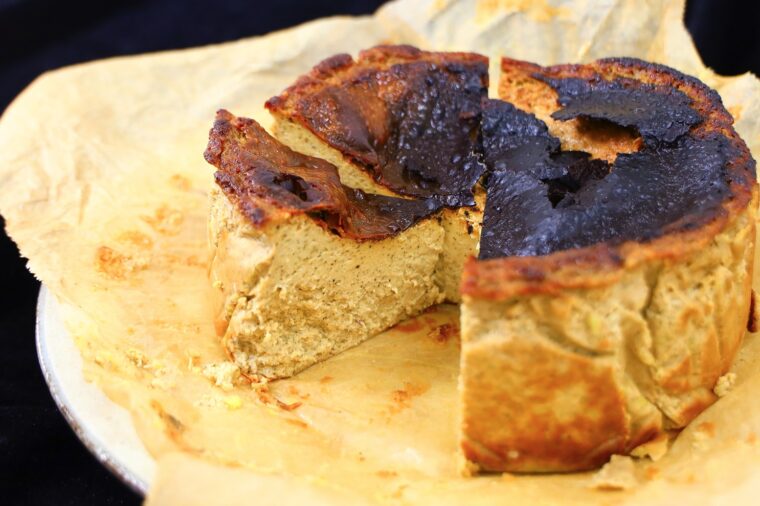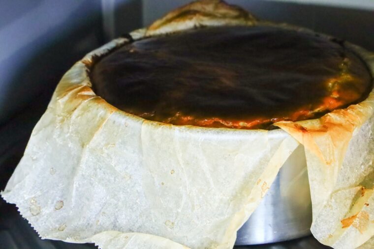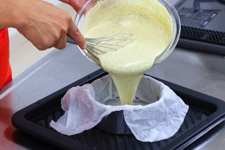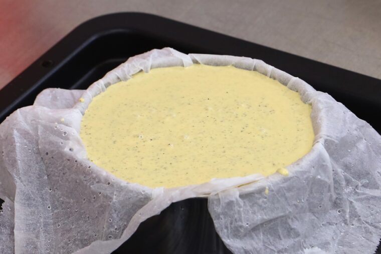 (4).水で濡らしてくしゃくしゃに丸めてから開いたクッキングシートを、丸型に敷く(型はパウンド型でもスクエア型でもOK)。丸型に(3)を流し入れて、オーブンを200~220度に設定して45分焼く。 表面にしっかり焼き色がついたら粗熱を取って、冷蔵庫でしっかりと冷やし固めて完成。