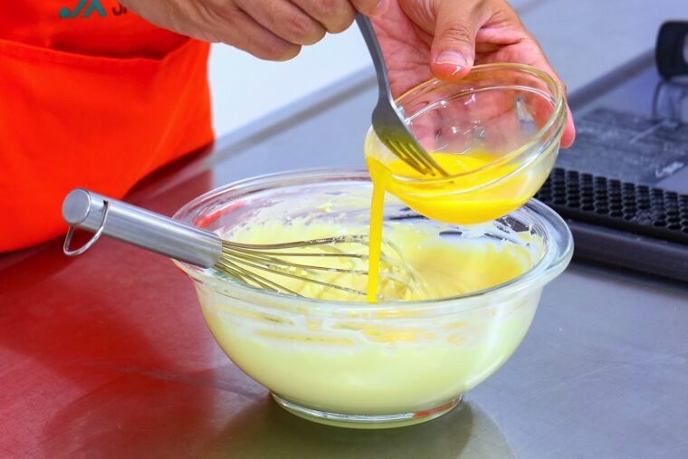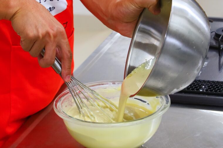 (3).卵を3回に分けて加えて、その都度よく混ぜる。 薄力粉も加えて混ぜて、 (1)の生クリームをザルや茶漉しを通しながら加えて混ぜる。