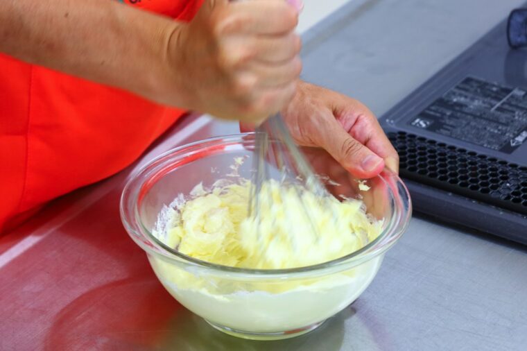 (2).ボウルにクリームチーズを入れてホイッパーでよく混ぜ、滑らかになったら砂糖を加えて混ぜる。