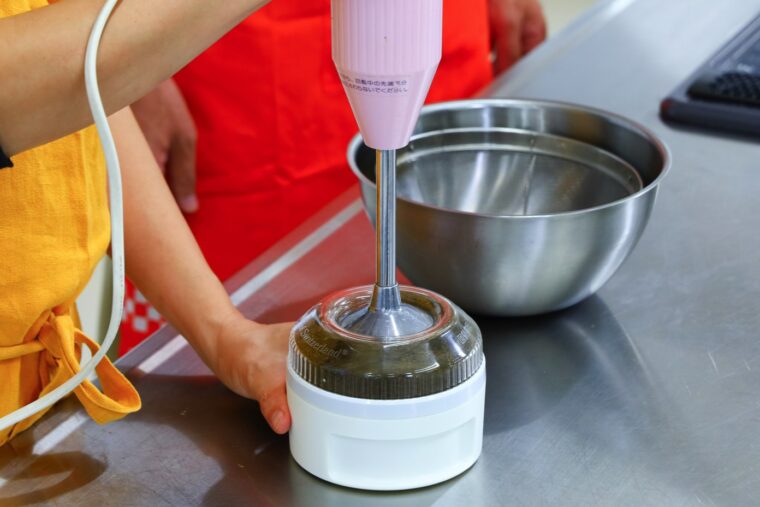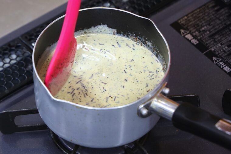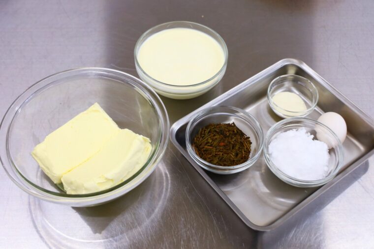 (1).佐渡番茶をフードプロセッサーなどで撹拌し細かくしておく (すり鉢で擦ったり、ティーバッグのお茶の中身を使ってもよい)。 小鍋に生クリーム、佐渡番茶を入れて火にかける。沸々してきたら弱火にして2分煮出して冷ます。