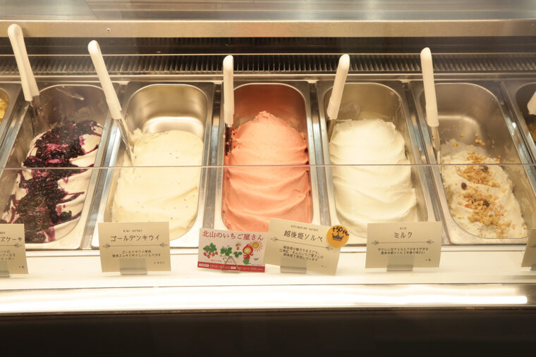 写真は取材時の提供メニューで、左奥は江南区産の越後姫を使った『越後姫ソルベ』(今季は提供終了)のシングル、右奥は『越後姫ソルベ』と『グラノラミルク』のダブル、手前は秋葉区のはしもと養蜂園の天然ハチミツを使った『ハニーヨーグルト』と秋葉区石津養鶏場の平飼い卵を使った『キャラメルカスタード』、乳不使用なのに生チョコのような濃厚な口当たりと風味を楽しめて、しかも甘すぎない『濃いチョコソルベ』のトリプル。