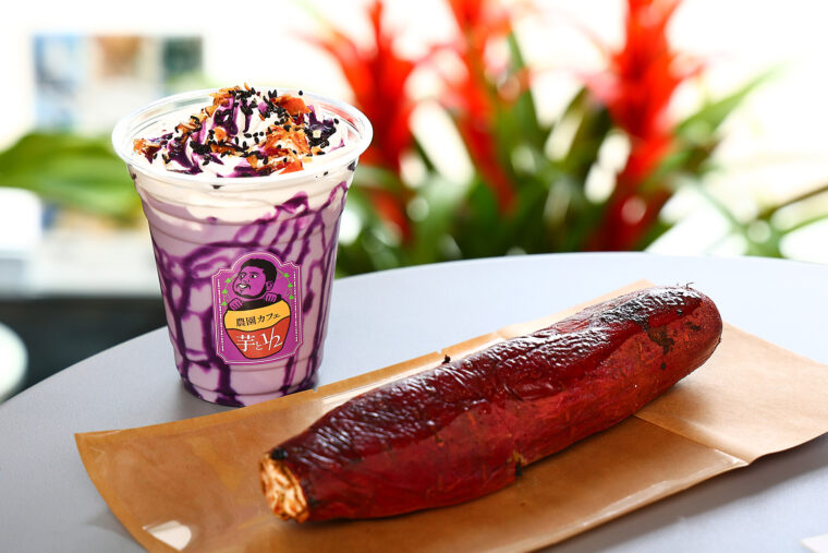 写真は夏におすすめの、ひんやり甘い『冷やし芋』と、紫芋の壷焼き芋をたっぷり使った『芋シェイク(パープル)』(700 円)。