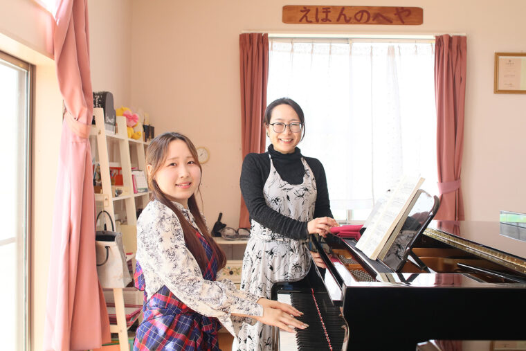 喫茶スペース脇では店主・鈴木牧子さんと娘の快(こころ)さんがピアノ教室を開講中。