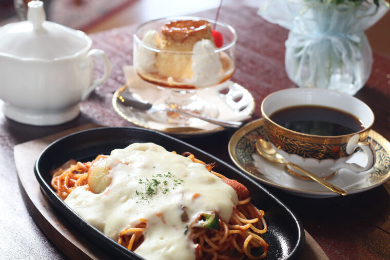 クラシックな雰囲気が広がる旧遊戯室で、ショパンのピアノ曲に耳を傾けながら『ナポリ風(ナポリタンのホワイトソースがけ)』(1,100円)や『昭和プリン』(600 円)などを味わえます。