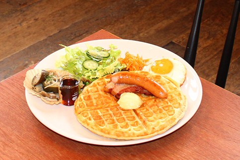 看板メニューは『ワッフルプレート』。県産小麦・ゆきちからで作った外はさっくり、中はモチモチ食感のワッフルに副菜を盛り合わせた一品です。