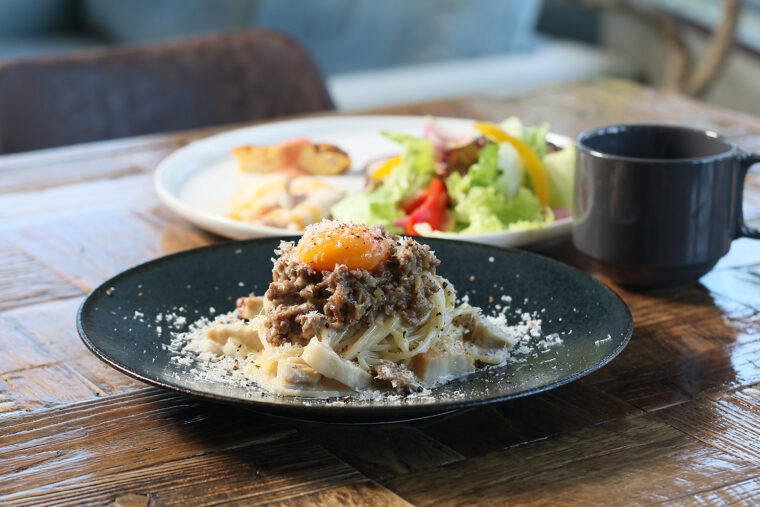 クリームソースを絡めた麺に、肉味噌と卵黄の味噌漬けをのせたオリジナルメニューで、プラス400円で日替わりの前菜、サラダ、スープが付きます。