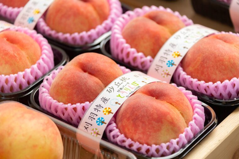 7~8月の収穫期になると、箱詰めされた砂丘桃が村の特産品として全国発送されます。生産量が少ないうえ、すぐ売り切れてしまうことから「幻の桃」とも呼ばれています。刈羽村宿泊交流センターピーチビレッジで買い求めることができるので、ぜひ味わってみて。