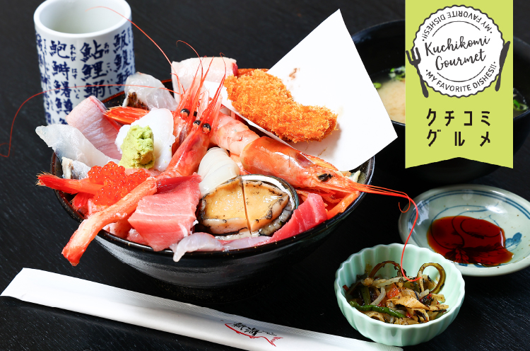 名物は、県産コシヒカリを使った酢飯に、15種類を超える旬なネタをうつわからあふれそうなほどたっぷりとのせた『海鮮丼』。