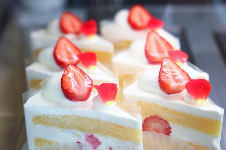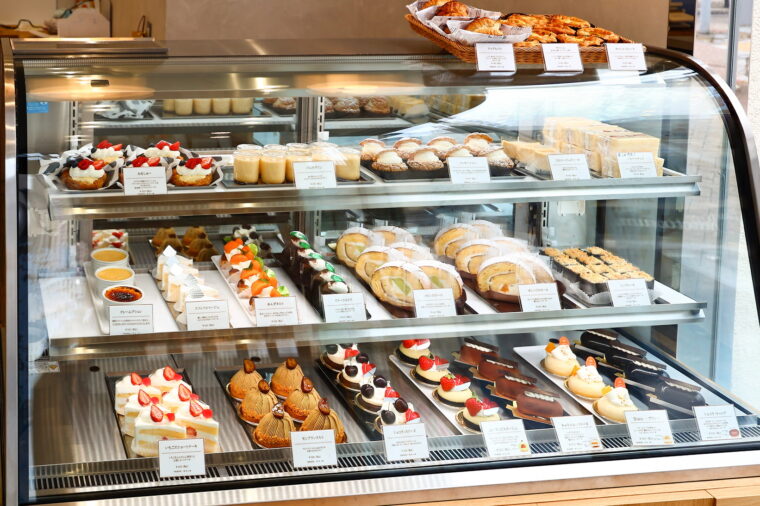 定番の『ショートケーキ』や『クレームブリュレ』『ロールケーキ』から季節商品まで、目にも鮮やかなケーキがズラリと並びます。