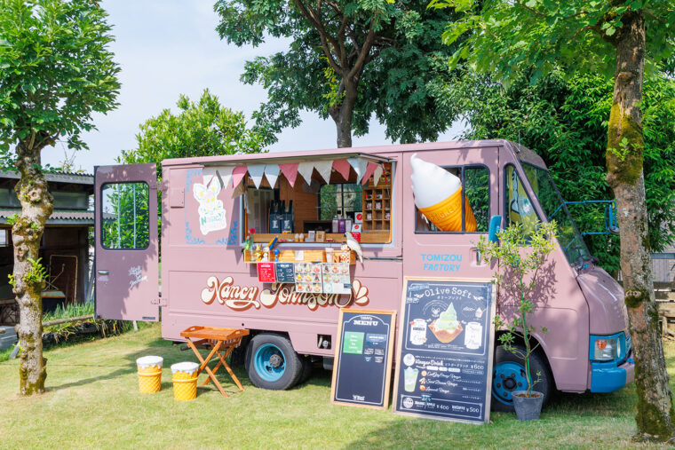 ピンクに青の差し色が入ったおしゃれなキッチンカーでソフトクリームを販売しているNancy Johnson(ナンシージョンソン)。