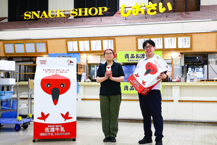 写真上の大きな佐渡牛乳のパッケージは、お店近くに置いてあるオブジェ。