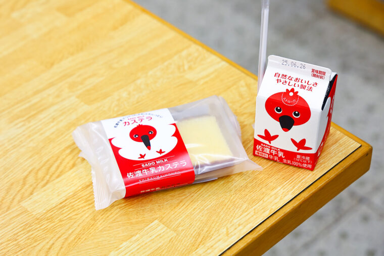 『佐渡牛乳カステラ』や『佐渡牛乳』(写真は200ml)などのお土産はターミナル内のショップ、 トキめき館で販売しています。