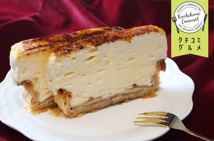プリン風味のリンゴパイの上に、メレンゲとカスタードクリームを合わせたふわシュワ食感のムース生地を重ね、クレームブリュレのように上面をバーナーで炙っています。