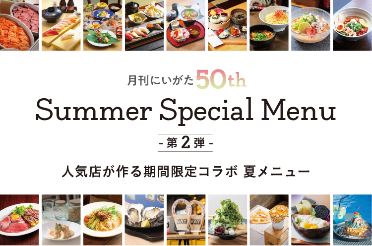 グルメ 【月刊にいがた50th Summer Special Menu】好評につき夏メニューもやっちゃいます!50周年コラボメニュー第2弾 新潟市中央区新潟市北・東区新潟市江南・秋葉・南区新潟市西・西蒲区下越中越三条市弥彦村新潟市阿賀野市グルメグルメ 情報掲載日:2025.07.25 ※最新の情報とは異なる場合があります。ご了承ください。 Tweet 皆様のおかげで『月刊にいがた』は2025年11月号で創刊50周年! 現在「50周年イヤー」のまっただなか。 昨年12月号で展開した「50周年記念特別コラボメニュー」企画の好評を受けて、今回は「夏メニュー」として展開。またも人気店に期間限定のスペシャルメニューを作ってもらいました! そして今回、8月号では第2弾として18店舗を紹介。 第1弾の7店舗とプラスすると25の限定コラボメニューが楽しめます。 どうぞお楽しみに! 第1弾メニューはこちらをチェック - 50周年メニュー 第2弾はこちら!! 5yukuri『チョコミントワッフル』 &の森『夏のトロピカルセット』 ジラフクレープ新潟万代店『クリームピーチクレープ』 BAY『SUMMERセット』 甘味処 鎌倉『店内仕込み 特製抹茶蜜 抹茶金時 わらびもちトッピング』 FISHERMAN'S MARKET OYSTER BAR『焼き特大岩牡蠣(2個)』 イタリア料理&バールたんと『桃の冷製パスタ』 SUMER(シュメール)『冷製豆乳味噌たんたん麺』 SAKURAGI BUTCHER HORLY'S 『ローストビーフ丼&国産牛ステーキ』 麺や真玄『海老とトマトの冷製和え麺』 ラーメン・餃子専門店 満里『冷しゃぶマヨラー』 二代目猫満 めんや銀猫『マーボーつけめん』 おこめ日和『楽座御膳 ~RAKUZA~』 旬菜厨房 和楽 県央店『佐渡産イカのゴロ焼き鉄板と海鮮丼セット』 鮨・割烹 丸伊『創業祭ランチセット 富寿し新潟駅前店『記念握り』 割烹大善『会席フルコースと 新潟えだまめ盛』 しゃぶ鍋ビュッフェNS+ 『ローストビーフと 特上サーモンも食べ放題』