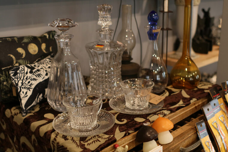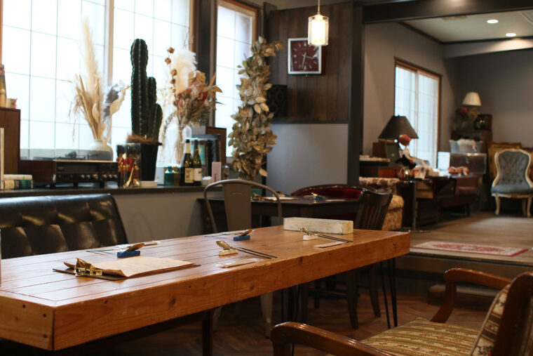 また一角に並ぶアンティーク調の家具や雑貨はマルヤマさんが趣味で集めたもので、購入も可能です。