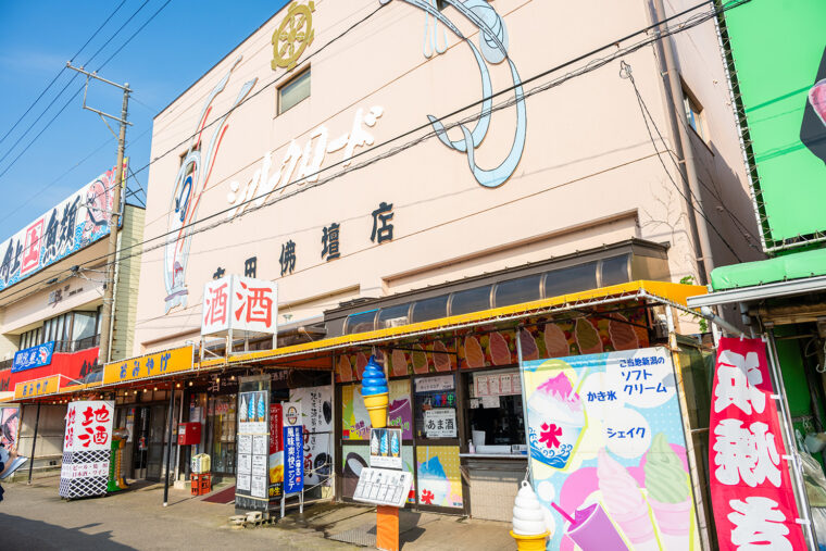 店頭でソフトクリームを販売しており、特に「青いソフトクリーム」で有名。市場通りの散策途中にぜひ立ち寄って。