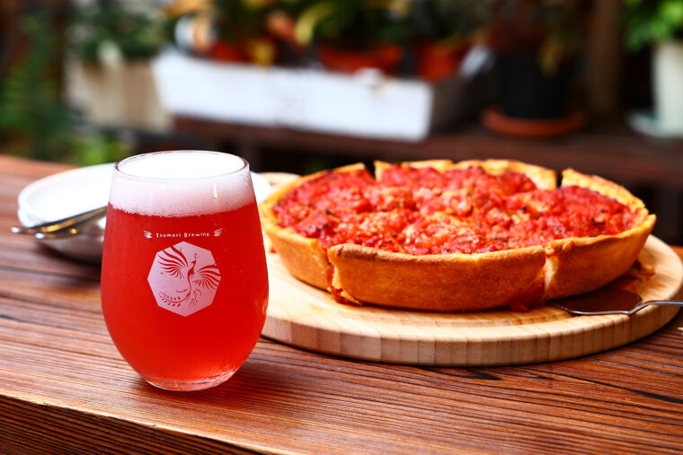 ビールと一緒に味わいたいのが上写真奥の『シカゴスタイルピザ』(3,080 円)。妻有ビール代表の髙木千歩さんが十日町市内で営んでいたレストランで提供していたものです。