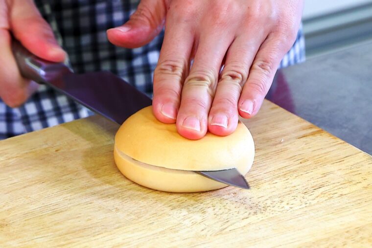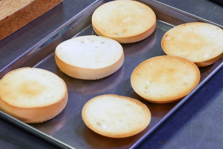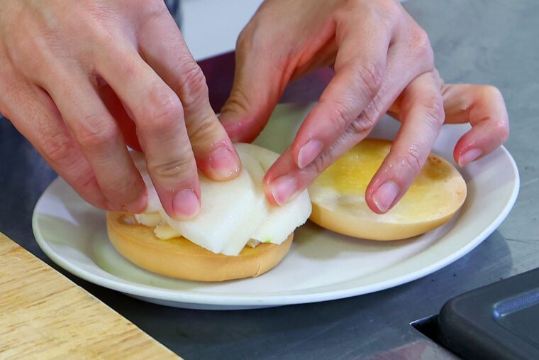 (1).パンを半分の厚さに切って(食パンの場合は2枚使う)、トースターなどでカリッと焼いておく。チーズと梨を5ミリ幅に切る。