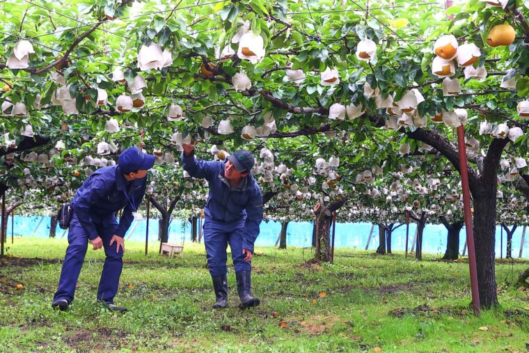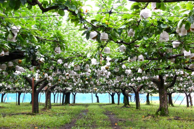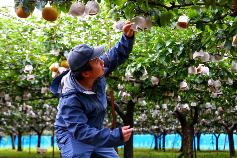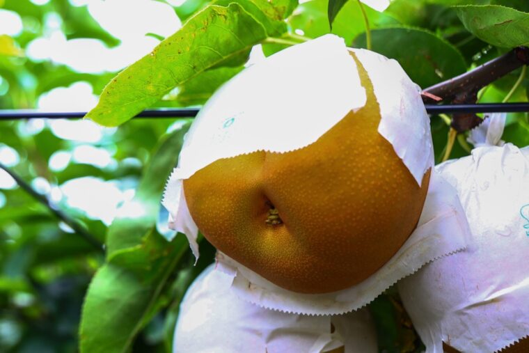 梨の栽培は一年を通して行なわれます。冬の剪定に始まり、春には枝を紐で固定する誘引、そして花粉付けや摘果と、病害虫や強い日差しから実を守るための袋掛けなど、手作業が多く、ひとつひとつの工程に手間と時間がかけられています。