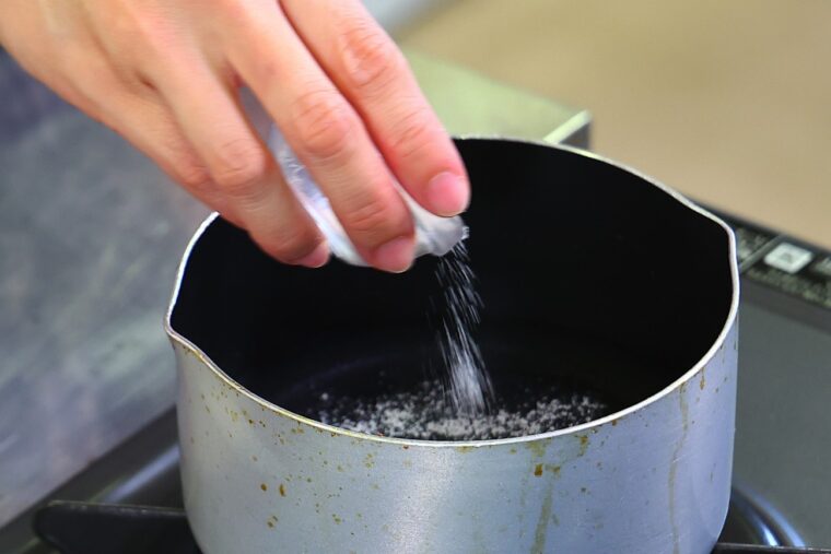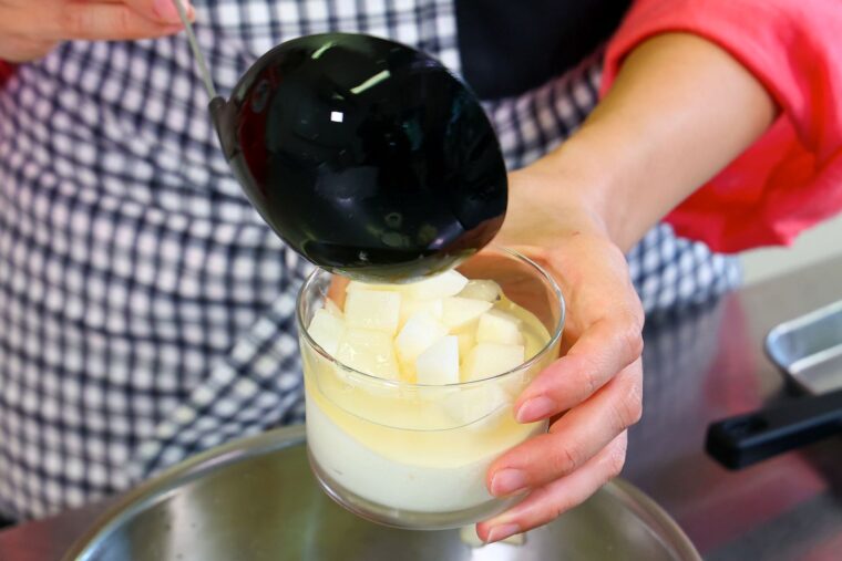 (4).鍋に(A)を加えて砂糖が溶けたら火を止め、ゼラチンをふり入れてよく混ぜる。(3)の梨を加え、粗熱が取れたらヨーグルトゼリーの上に流し入れて冷蔵庫で冷やし固める。