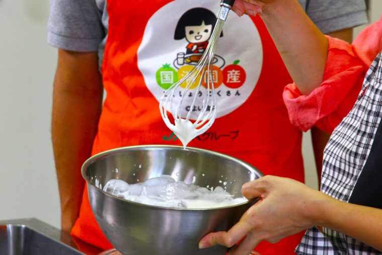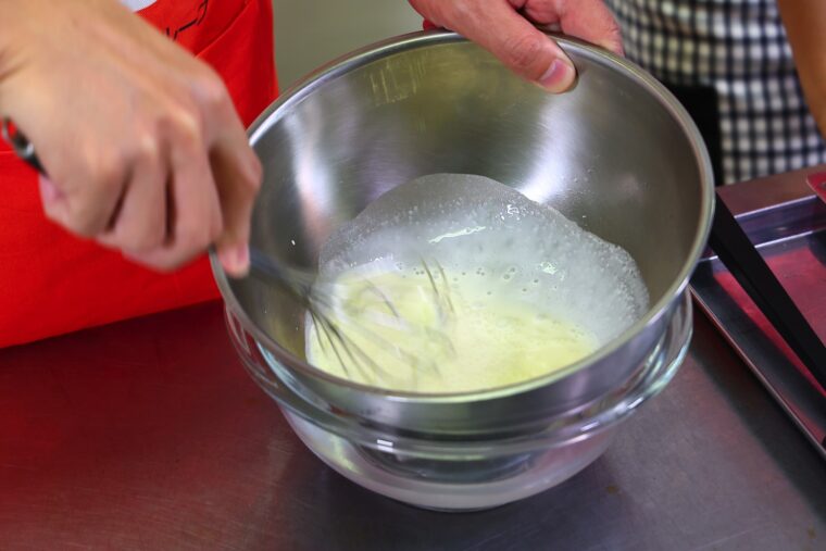 (1).【ヨーグルトゼリーを作る】生クリームに砂糖を加えて、氷水で冷やしながら泡立てる。すくい上げると生クリームの先端が、やわらかなお辞儀をするくらいの状態(8分立て)にする。