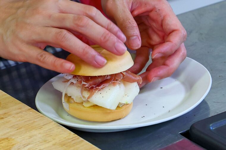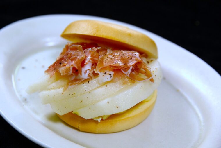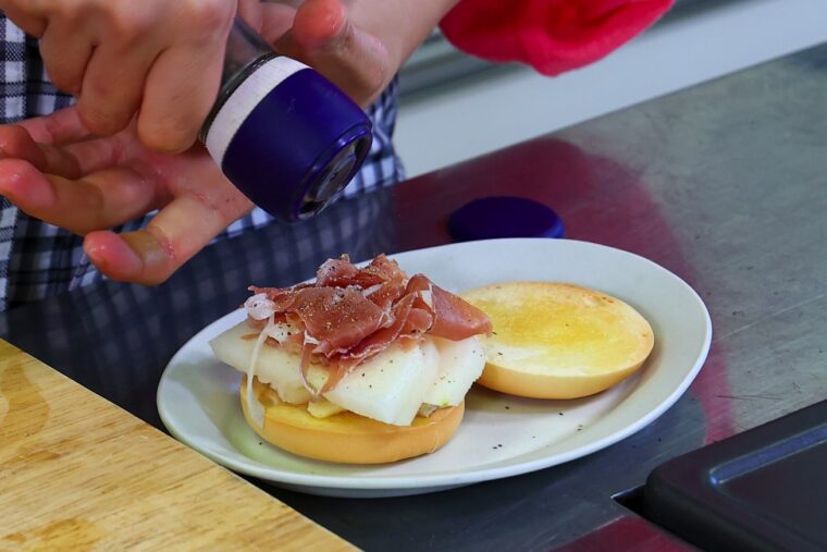 (2).パンにバターを薄く塗る。チーズ、梨、ハムの順にのせて黒胡椒をたっぷりとかけてパンで挟んで完成。