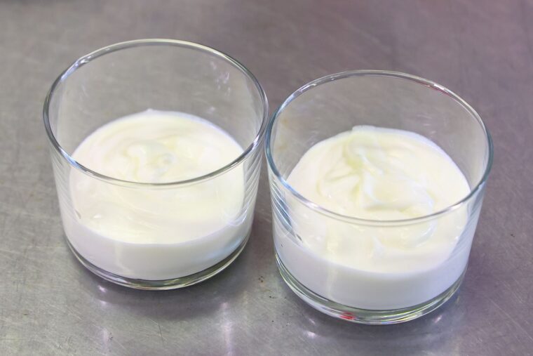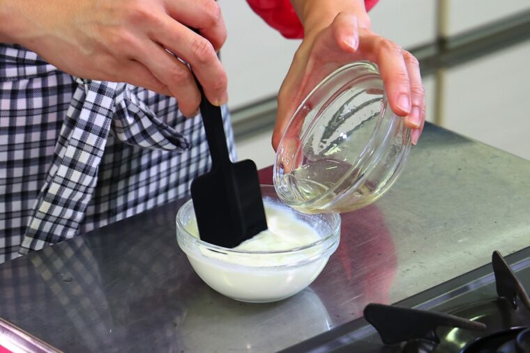 (2).お湯にゼラチンをふり入れてよく混ぜてヨーグルトと合わせる。それを(1)に加えて混ぜ合わせたら、器に流し入れて冷蔵庫で冷やし固める。