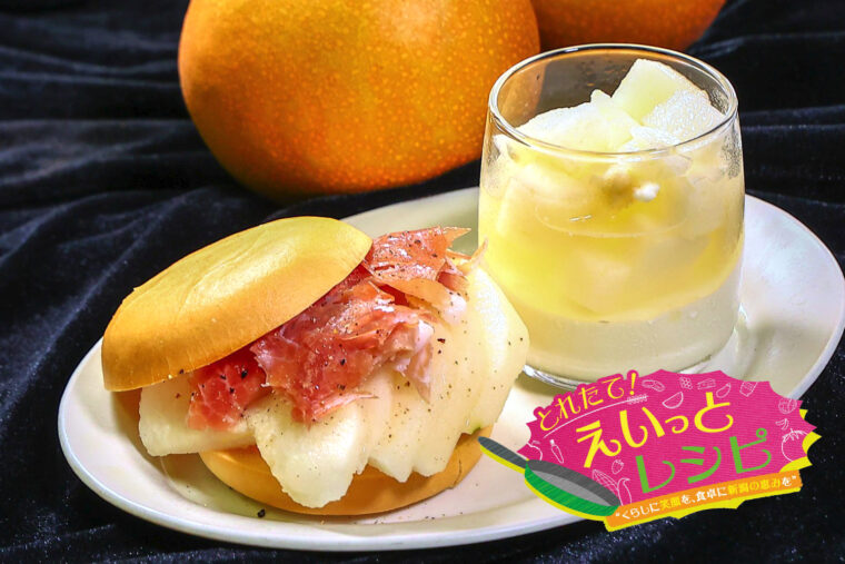 今回の『とれたて! えいっとレシピ』では、新潟市南区の白根エリアで梨を生産する長谷川さんと、JA新潟かがやきしろね北アグリセンターの中村さんに登場していただきました。