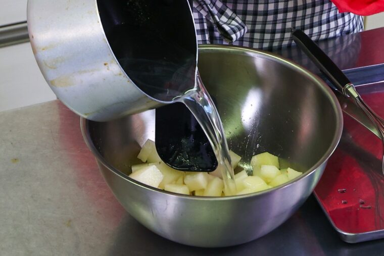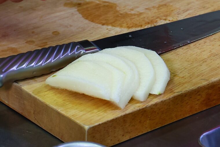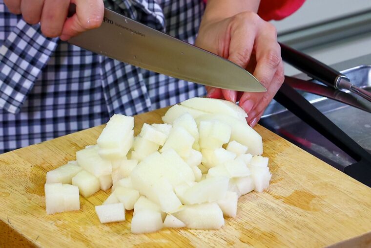 (3).【梨ゼリーを作る】梨の皮をむいて1.5センチ角に切る。