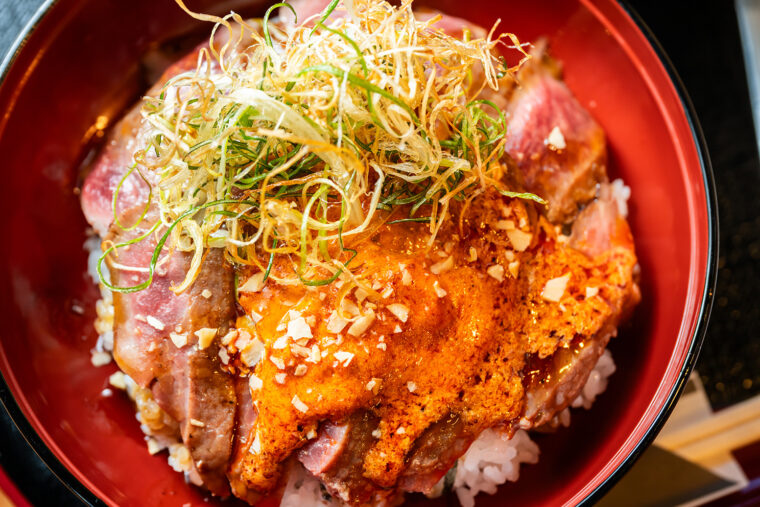 なかでも上写真の『閻魔ステーキ丼』は、辛いもの好きの店長・池田さんが試作を重ね、7月からメニューに仲間入りしました。ミディアムのステーキに、『悪魔ステーキ丼』に使用しているガーリックソース、スンドゥブソース、自家製ラー油で作ったソースをのせています。