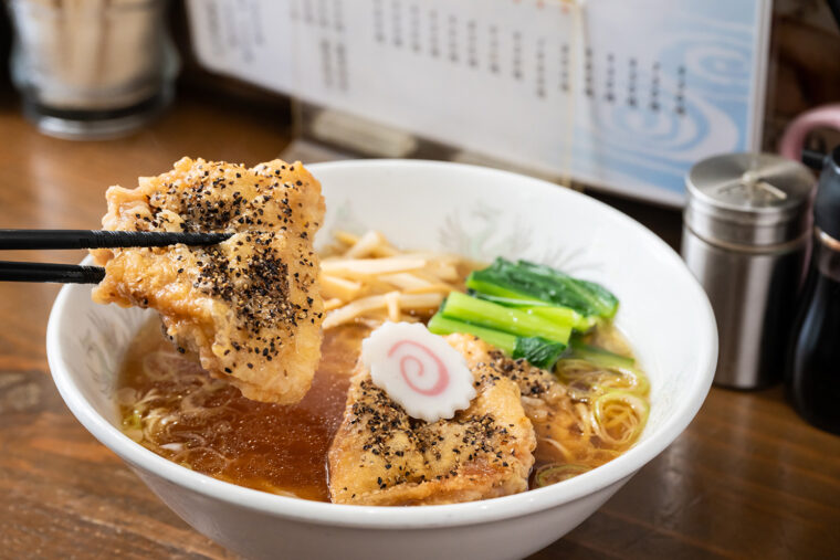 粗挽き黒コショウのきいた拳サイズの大きな唐揚げを2個のせた名物ラーメン。