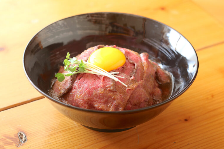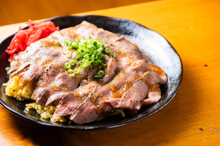 近所にある漬物店、田村定吉商店の大根の味噌漬けと大葉がアクセントになったピリ辛チャーハンの上に、あがの姫牛を用いた炙りローストビーフを贅沢に敷き詰めています。