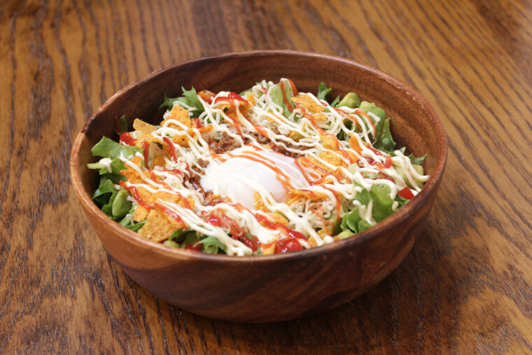 トロッとした温泉卵とパリパリのトルティーヤチップスをトッピングしています。マヨとケチャップのダブルソースで、中毒性のある味わいに。