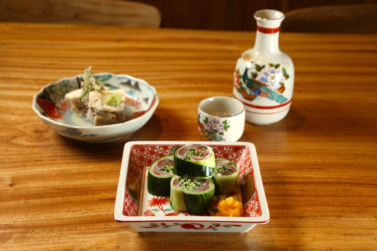 すでに話題となっているメニューが、新鮮なイワシを薄く剥いたキュウリで巻いた『いわしのあて巻き』(950円)と、豚肉のうまみが際立つ『–わさびで食べる–自家製塩角煮』(1,100円)。
