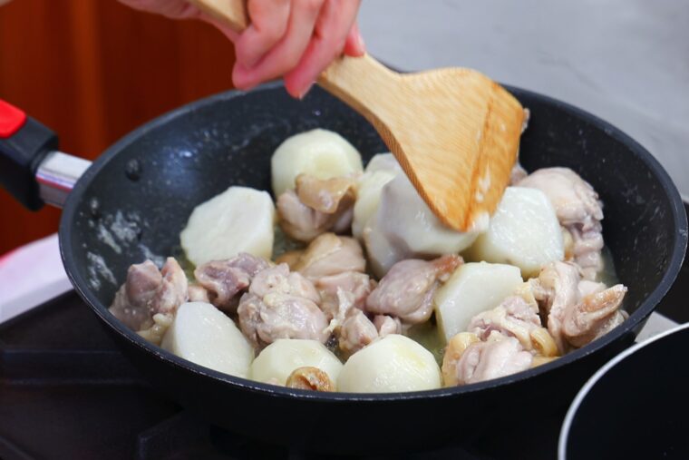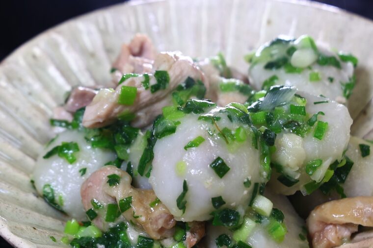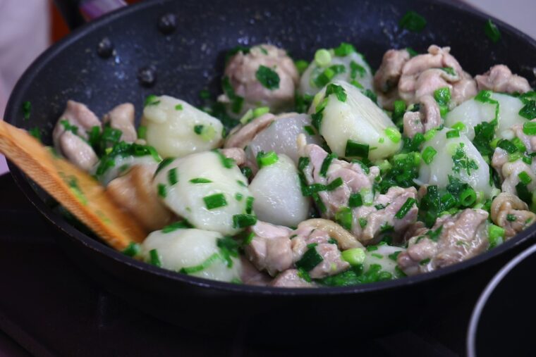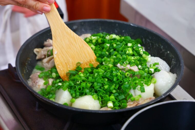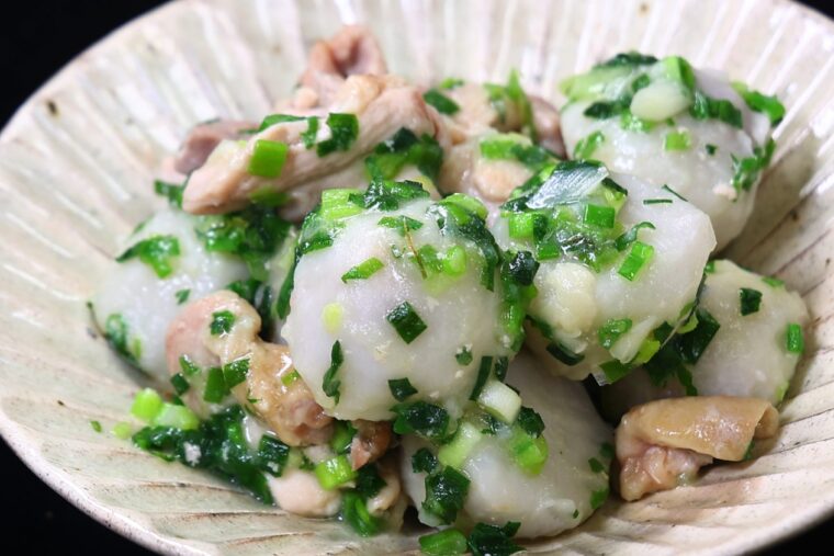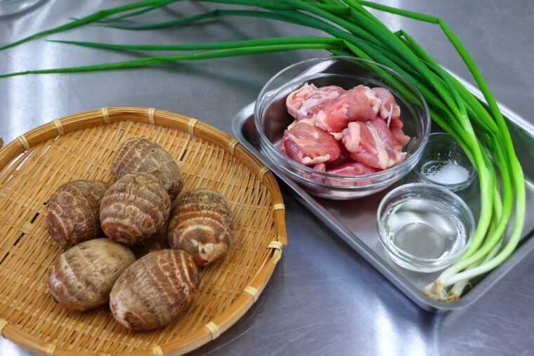(1).鶏肉を大きめのひと口大に切る。「砂里芋」は皮をむき、大きいものは半分に切って水にさらす。ねぎは小口切りにする。