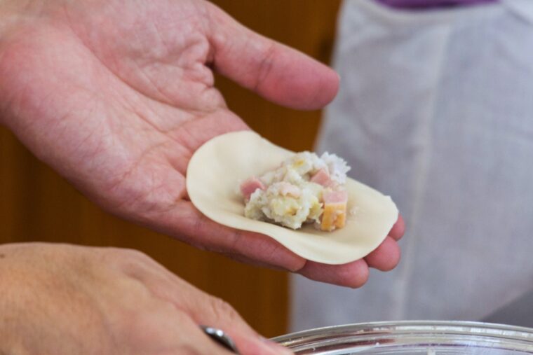 (3).餃子の皮に(2)をのせて、皮の周囲に水をつけて包む。