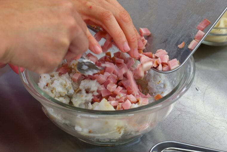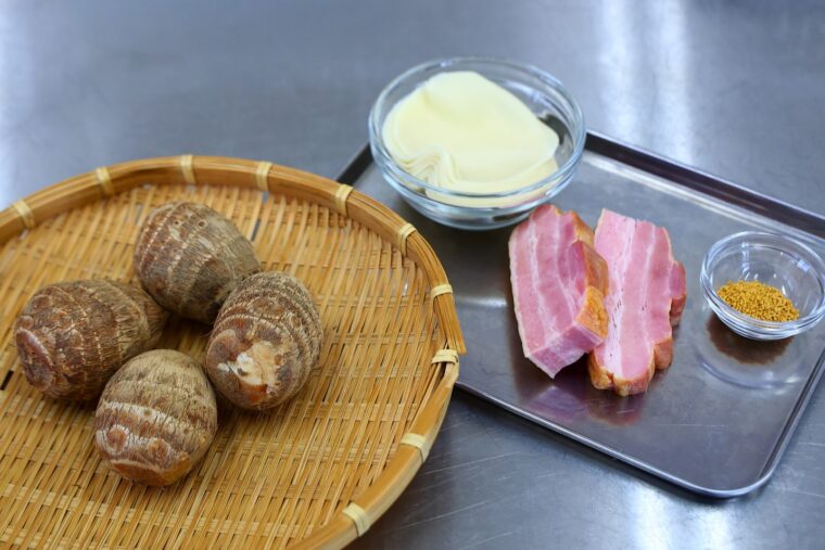 (2).『砂里芋』の皮をむき、つぶしてコンソメと、角切りしたベーコンを入れてよく混ぜる。