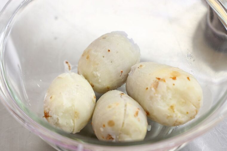 (1).「砂里芋」を水でしっかりと洗って、皮にぐるっと一周切り込みを入れる。耐熱の皿に並べてふんわりラップをしたら、レンジで「砂里芋」がやわらかくなるまで4〜5分加熱する。