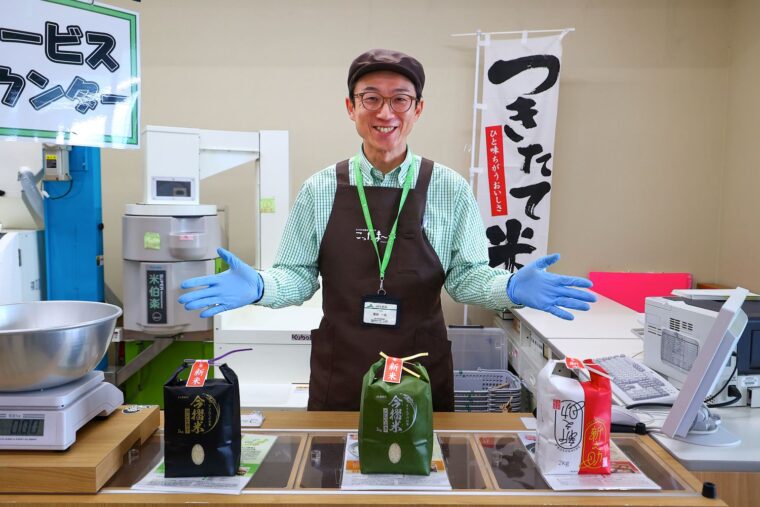 こったま~やでは、地場産の「コシヒカリ」「こしいぶき」「新之助」を、必要な分だけその場で精米する「今摺米(いまずりまい)」として購入することができます。