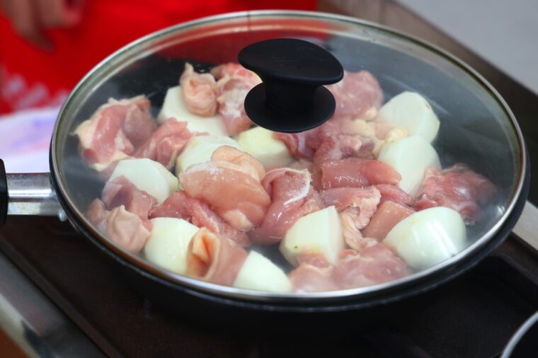 (2).鍋にねぎ以外の材料を入れて火にかける。鍋が温まったら蓋をして10分加熱する。時々アクを取り、「砂里芋」をひっくり返す。「砂里芋」に火が通ったら蓋を外して汁気を飛ばす。