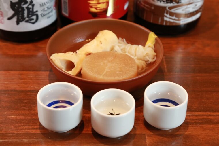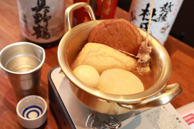 フードは、日本酒と相性抜群のアゴだしがしっかりときいた自家製おでんを基本に、砂肝キュウリ、鯨の味噌漬けなどを用意しています。