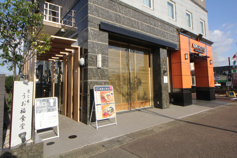 燕三条駅前にあるアパホテルの1階に、宿泊者以外にも利用できる飲食店、肴と米 うお福食堂がオープンしました。